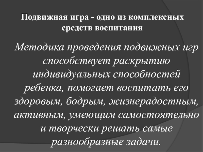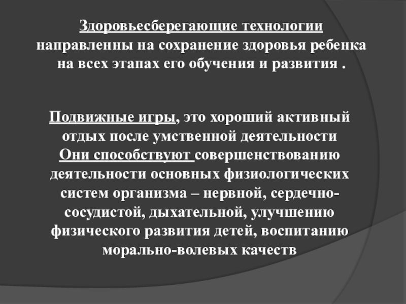Они способствуют совершенствованию деятельности основных физиологических систем организма – нервной, сердечно-сосудистой, дыхательной, улучшению физического развития детей, воспитанию морально-волевых качеств
