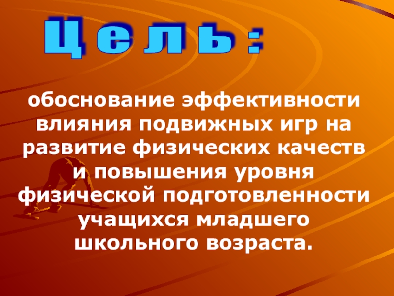 Ц е л ь :обоснование эффективности влияния подвижных игр на развитие физических качеств и повышения уровня физической подготовленности учащихся младшего школьного возраста.