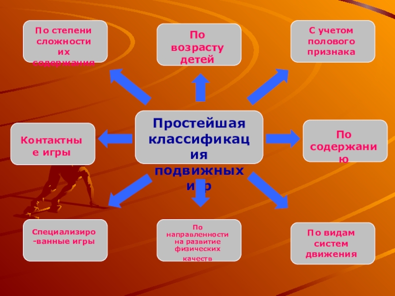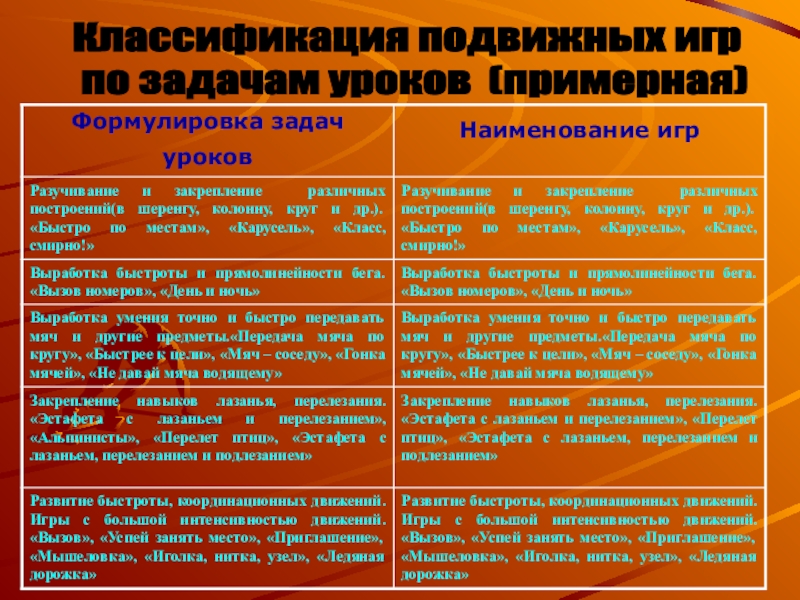 Слайд 5Классификация подвижных игр по задачам уроков (примерная)
