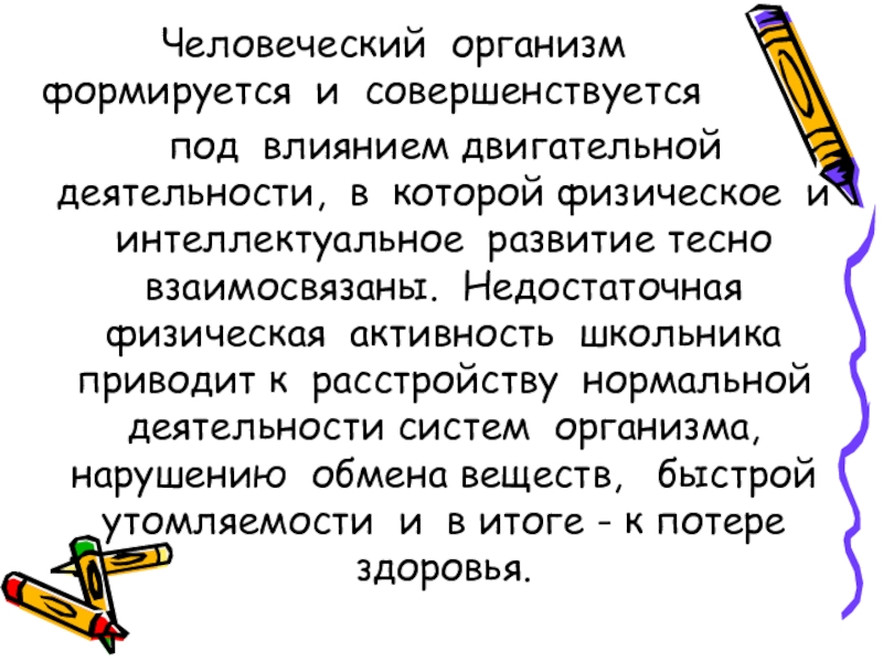 под влиянием двигательной деятельности, в которой физическое и интеллектуальное развитие тесно взаимосвязаны. Недостаточная физическая активность школьника приводит к расстройству нормальной деятельности систем организма, нарушению обмена веществ, быстрой утомляемости и в итоге - к потере здоровья.