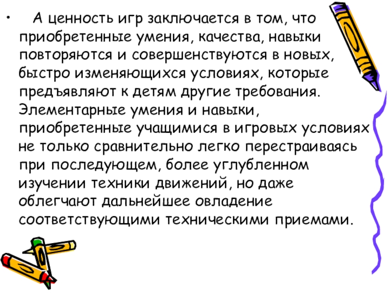 Слайд 19 А ценность игр заключается в том, что приобретенные умения,