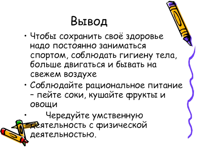 Чтобы сохранить своё здоровье надо постоянно заниматься спортом, соблюдать гигиену тела,