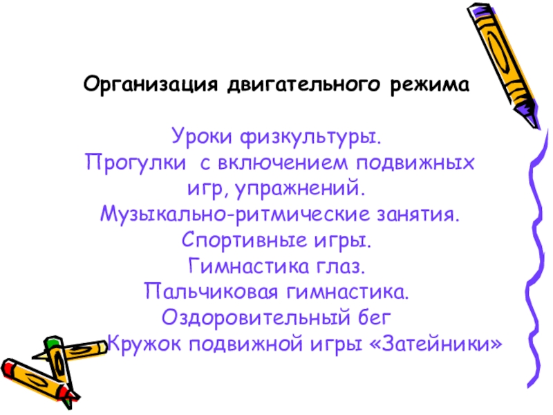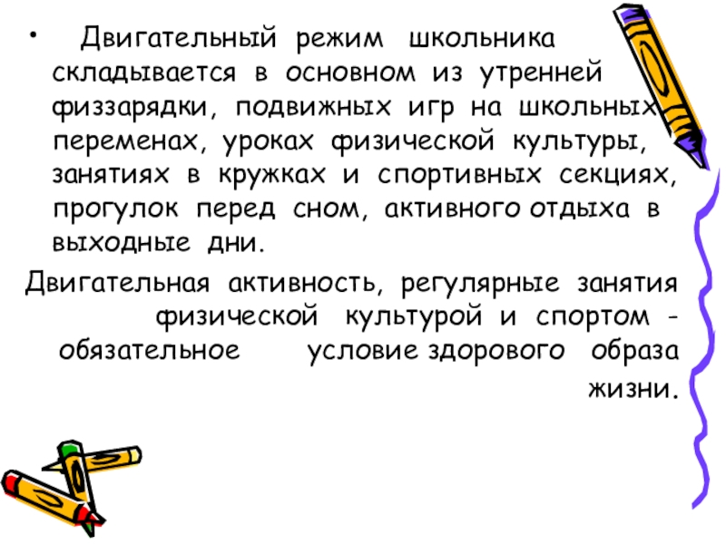 Слайд 9 Двигательный режим школьника складывается в основном из утренней