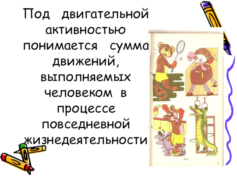 Слайд 5Под двигательной активностью понимается сумма движений, выполняемых человеком в