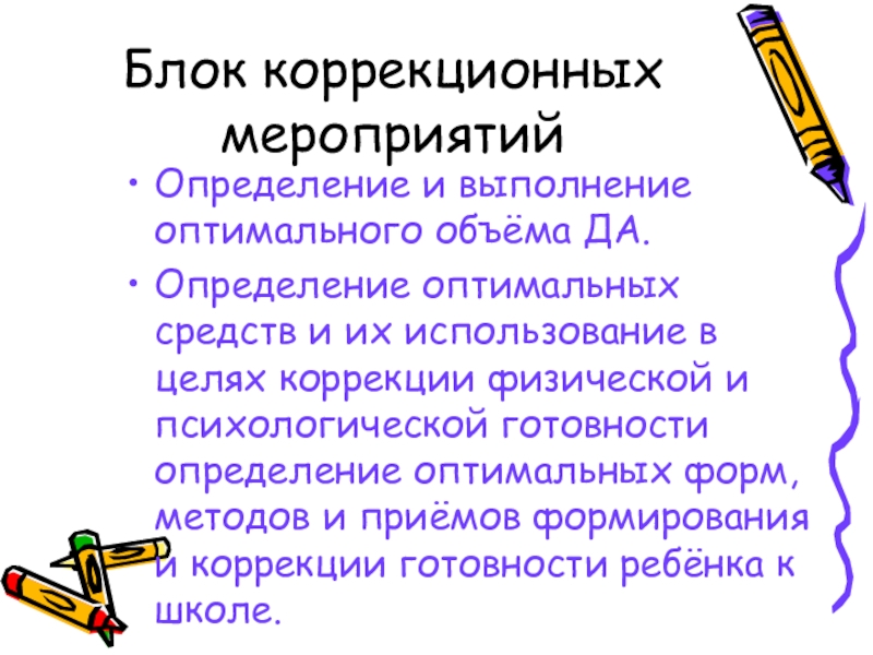 их использование в целях коррекции физической и психологической готовности определение оптимальных форм, методов и приёмов формирования и коррекции готовности ребёнка к школе.