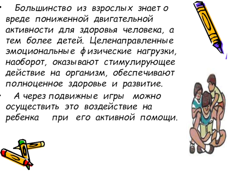 А через подвижные игры можно осуществить это воздействие на ребенка при его активной помощи.