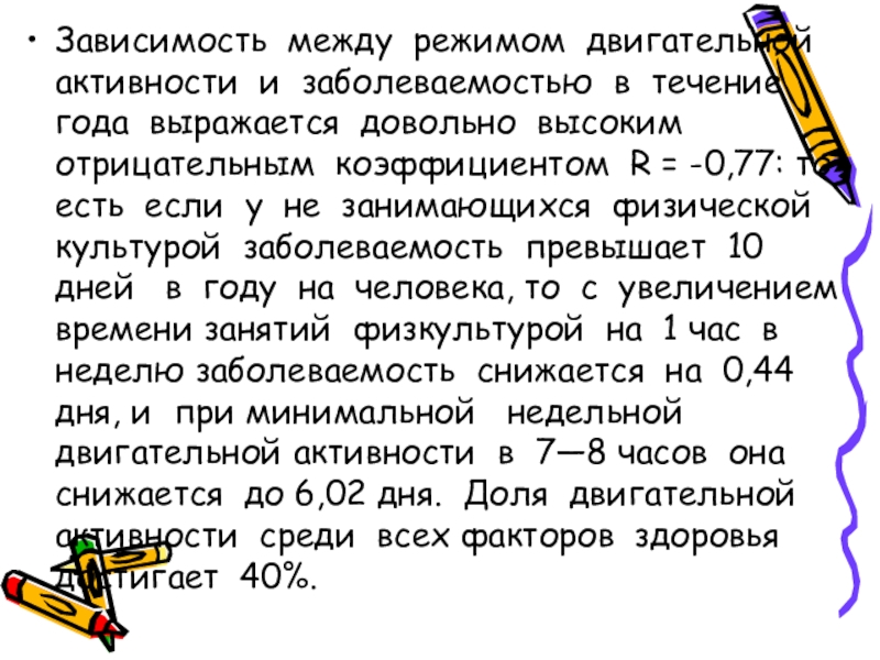 года выражается довольно высоким отрицательным коэффициентом R = -0,77: то есть если у не занимающихся физической культурой заболеваемость превышает 10 дней в году на человека, то с увеличением времени занятий физкультурой на 1 час в неделю заболеваемость снижается на 0,44 дня, и при минимальной недельной двигательной активности в 7—8 часов она снижается до 6,02 дня. Доля двигательной активности среди всех факторов здоровья достигает 40%.