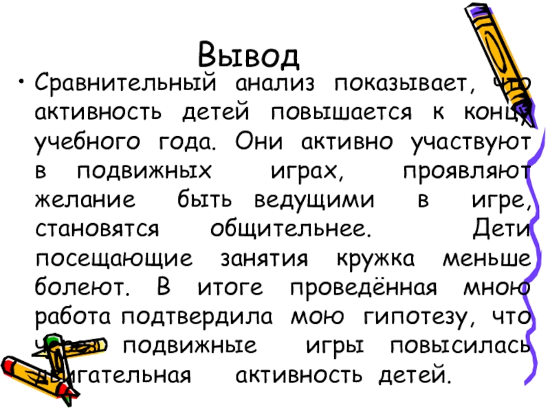 Они активно участвуют в подвижных играх, проявляют желание быть ведущими в игре, становятся общительнее. Дети посещающие занятия кружка меньше болеют. В итоге проведённая мною работа подтвердила мою гипотезу, что через подвижные игры повысилась двигательная активность детей.