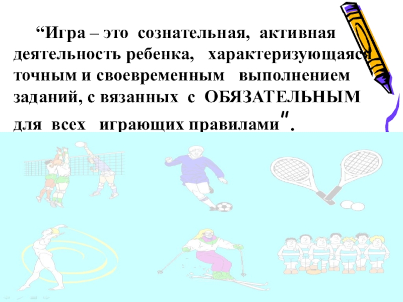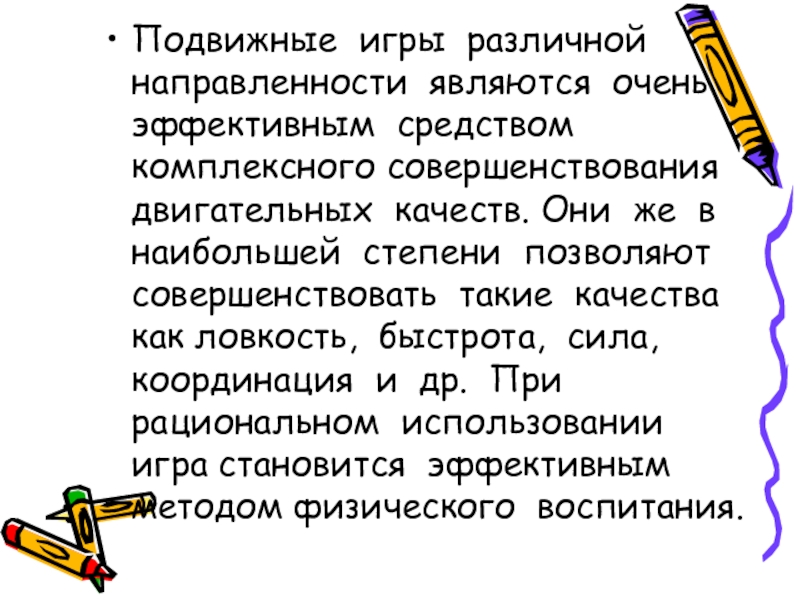 качеств. Они же в наибольшей степени позволяют совершенствовать такие качества как ловкость, быстрота, сила, координация и др. При рациональном использовании игра становится эффективным методом физического воспитания.