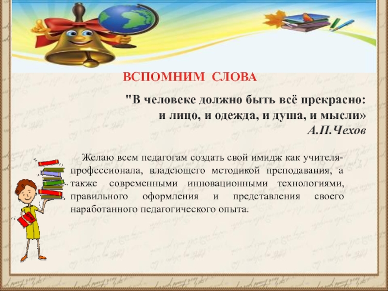 Желаю всем педагогам создать свой имидж как учителя-профессионала, владеющего методикой преподавания, а также современными инновационными технологиями, правильного оформления и представления своего наработанного педагогического опыта.