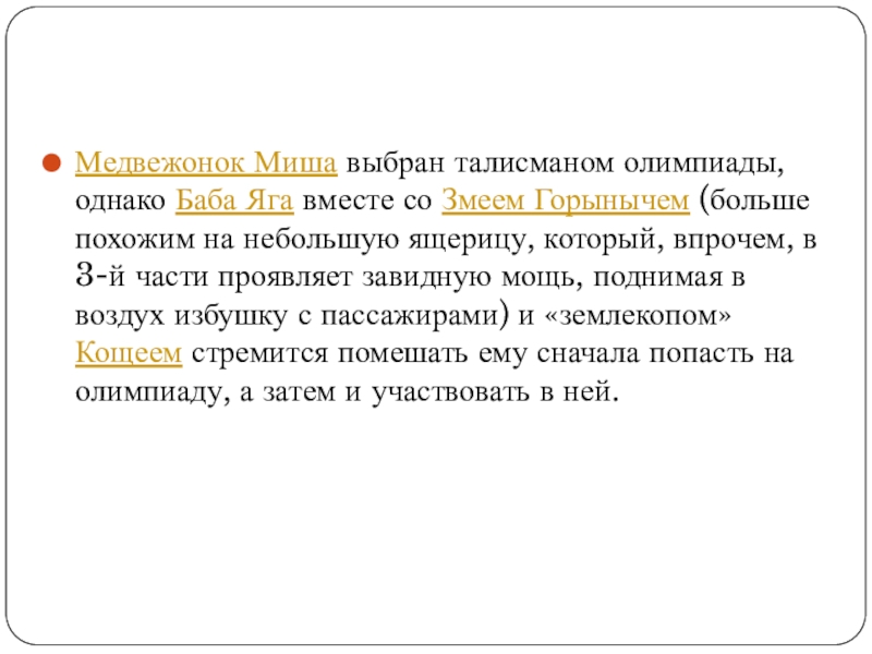 Слайд 5Медвежонок Миша выбран талисманом олимпиады, однако Баба Яга вместе со Змеем