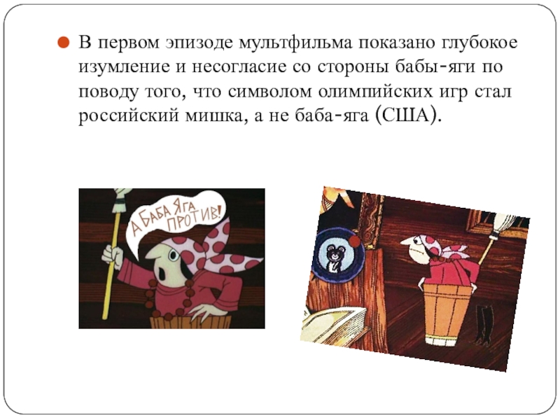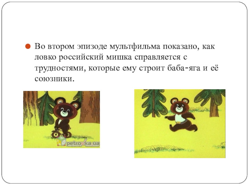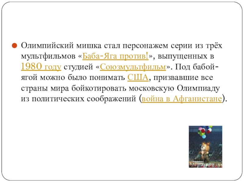 Слайд 4Олимпийский мишка стал персонажем серии из трёх мультфильмов «Баба-Яга против!», выпущенных