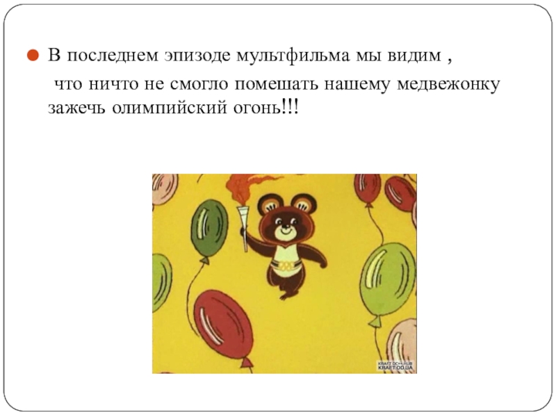 В последнем эпизоде мультфильма мы видим ,  что ничто не смогло помешать нашему медвежонку зажечь олимпийский