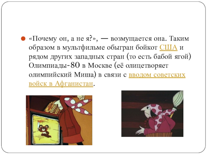 обыгран бойкот США и рядом других западных стран (то есть бабой ягой) Олимпиады-80 в Москве (её олицетворяет олимпийский Миша) в связи с вводом советских войск в Афганистан.