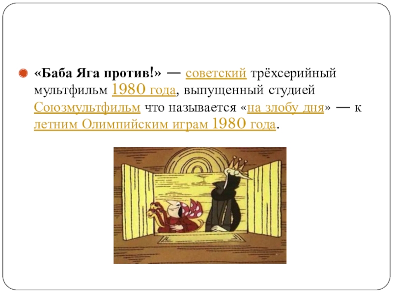 Слайд 2«Баба Яга против!» — советский трёхсерийный мультфильм 1980 года, выпущенный студией Союзмультфильм что