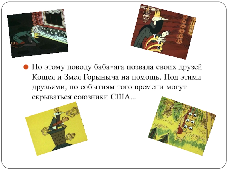 По этому поводу баба-яга позвала своих друзей Кощея и Змея Горыныча на помощь. Под этими друзьями, по