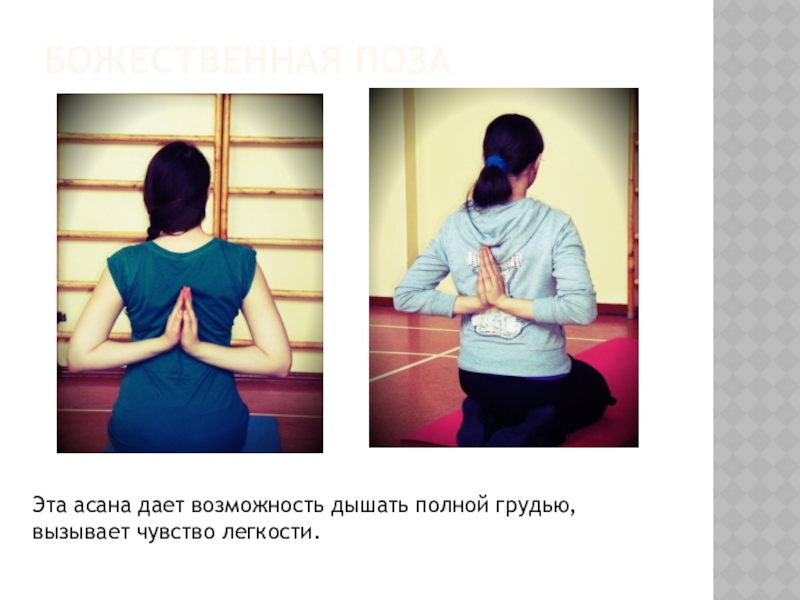 Эта асана дает возможность дышать полной грудью, вызывает чувство легкости.