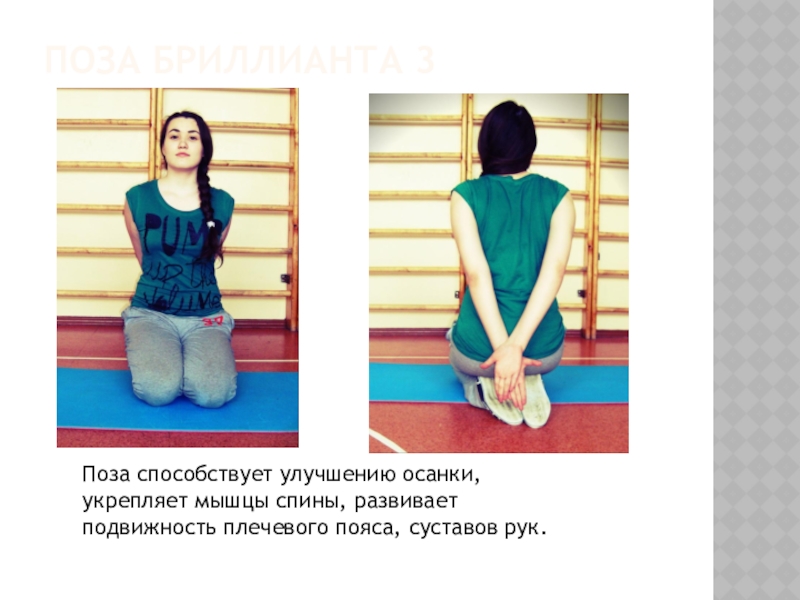 Поза способствует улучшению осанки, укрепляет мышцы спины, развивает подвижность