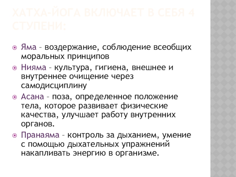 Слайд 7Хатха-йога включает в себя 4 ступени: