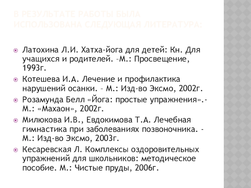 Котешева И.А. Лечение и профилактика нарушений осанки. – М.: Изд-во Эксмо, 2002г.