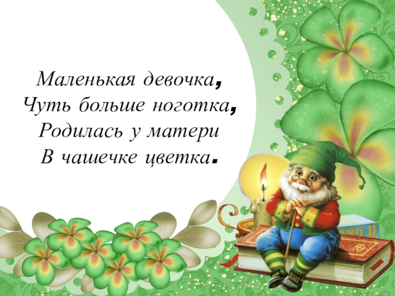Маленькая девочка, Чуть больше ноготка, Родилась у матери В чашечке цветка.