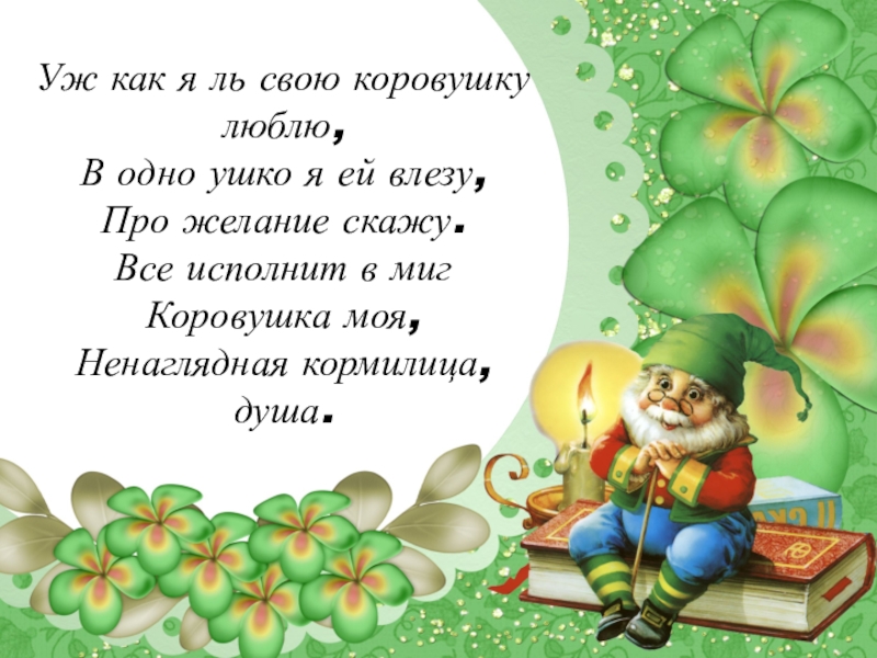 влезу, Про желание скажу. Все исполнит в миг Коровушка моя, Ненаглядная кормилица, душа.