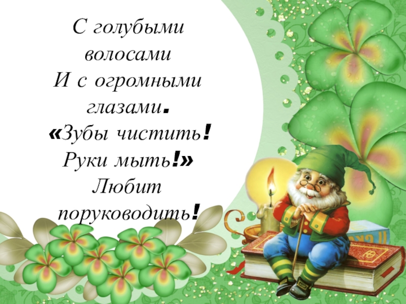 Слайд 11С голубыми волосами И с огромными глазами. «Зубы чистить! Руки мыть!» Любит поруководить!