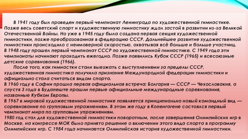 В 1941 году был проведен первый чемпионат Ленинграда по художественной гимнастике.
