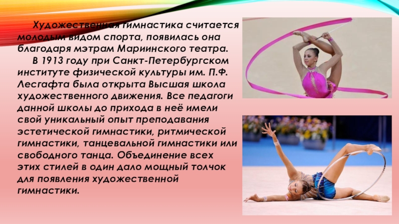 Слайд 9 Художественная гимнастика считается молодым видом спорта, появилась она благодаря мэтрам Мариинского