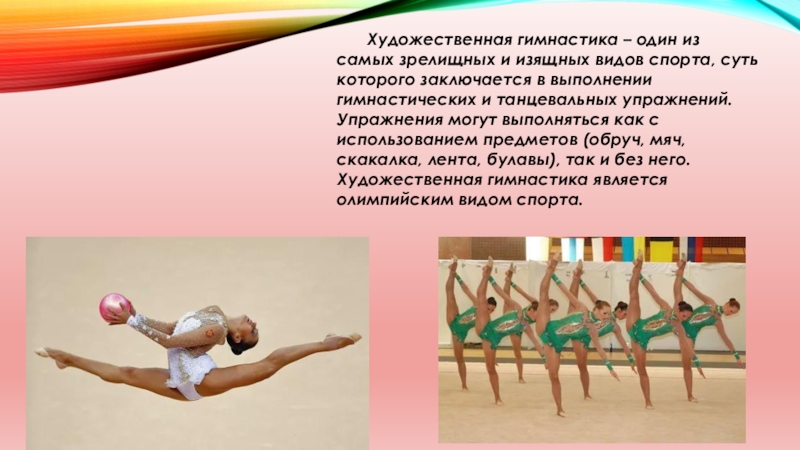 Слайд 2 Художественная гимнастика – один из самых зрелищных и изящных видов спорта,