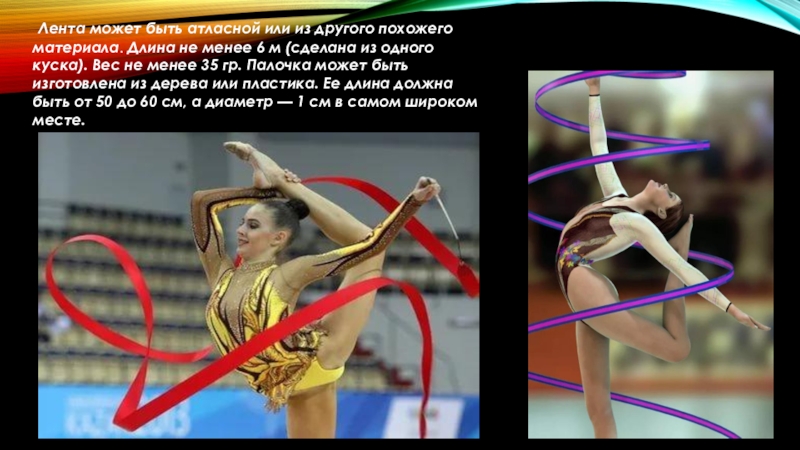 быть пропорциональна росту гимнастки и не должна иметь никаких ручек, вместо них на концах завязывают один или два узла.
