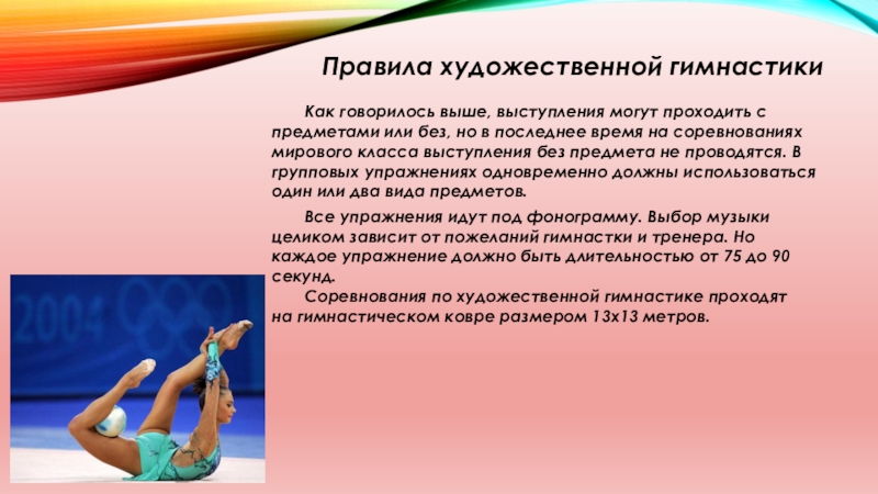 Соревнования по художественной гимнастике проходят на гимнастическом ковре размером 13х13 метров.