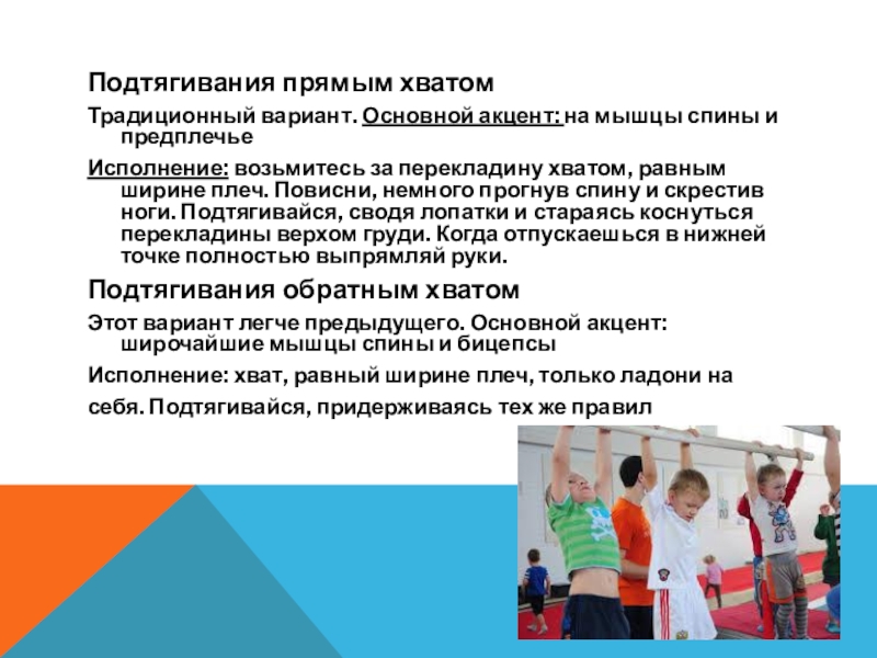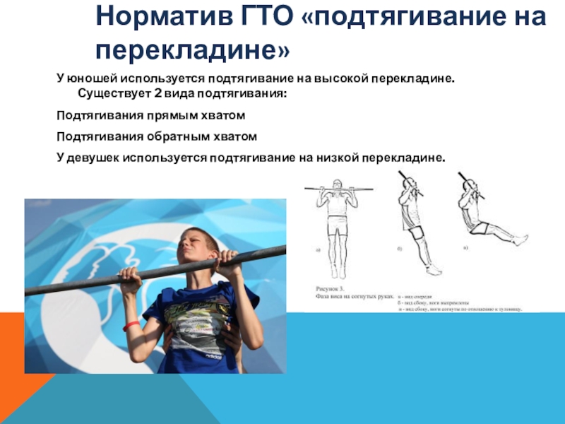 Слайд 11У юношей используется подтягивание на высокой перекладине. Существует 2 вида подтягивания: