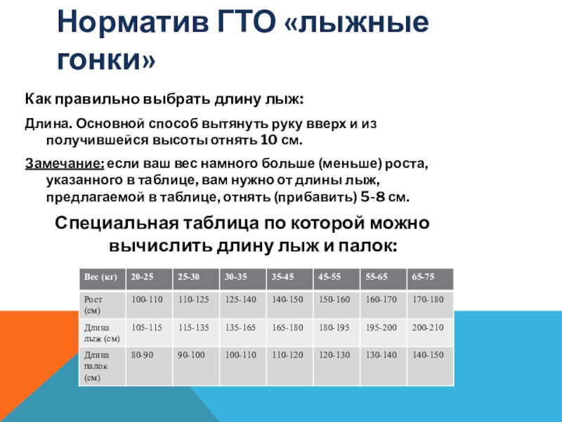 Замечание: если ваш вес намного больше (меньше) роста, указанного в таблице, вам нужно от длины лыж, предлагаемой в таблице, отнять (прибавить) 5-8 см.