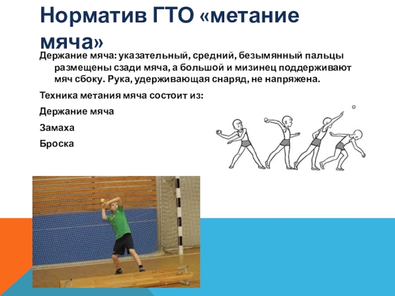 мяча, а большой и мизинец поддерживают мяч сбоку. Рука, удерживающая снаряд, не напряжена.