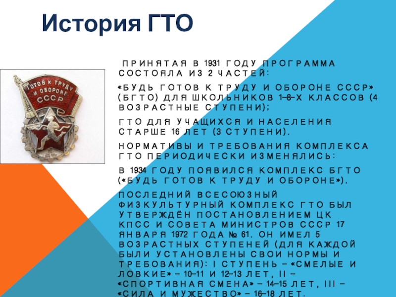 ПОСЛЕДНИЙ ВСЕСОЮЗНЫЙ ФИЗКУЛЬТУРНЫЙ КОМПЛЕКС ГТО БЫЛ УТВЕРЖДЁН ПОСТАНОВЛЕНИЕМ ЦК КПСС И СОВЕТА МИНИСТРОВ СССР 17 ЯНВАРЯ 1972 ГОДА № 61. ОН ИМЕЛ 5 ВОЗРАСТНЫХ СТУПЕНЕЙ (ДЛЯ КАЖДОЙ БЫЛИ УСТАНОВЛЕНЫ СВОИ НОРМЫ И ТРЕБОВАНИЯ): I СТУПЕНЬ — «СМЕЛЫЕ И ЛОВКИЕ» — 10—11 И 12—13 ЛЕТ, II — «СПОРТИВНАЯ СМЕНА» — 14—15 ЛЕТ, III — «СИЛА И МУЖЕСТВО» — 16—18 ЛЕТ.