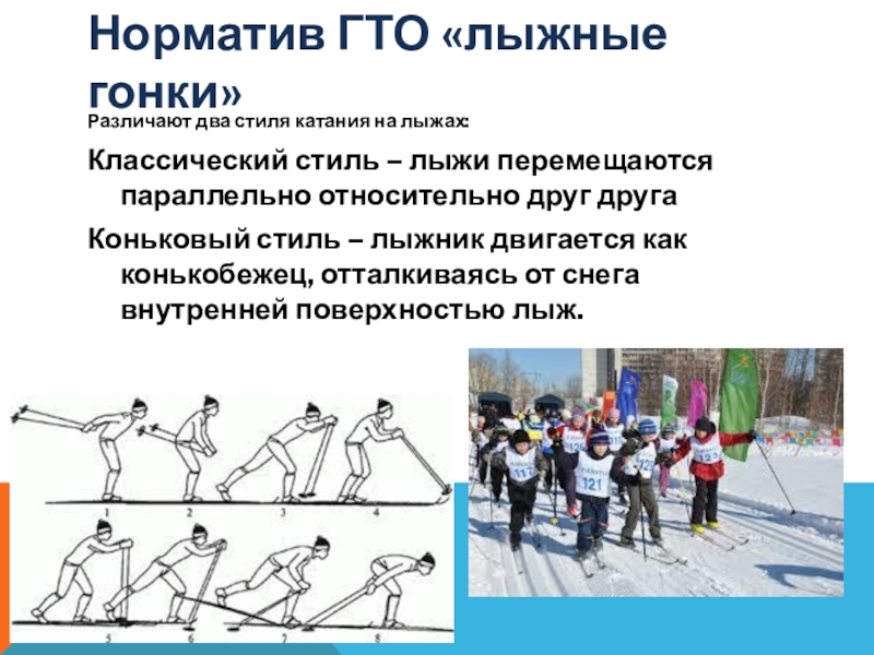 Коньковый стиль – лыжник двигается как конькобежец, отталкиваясь от снега внутренней поверхностью лыж.