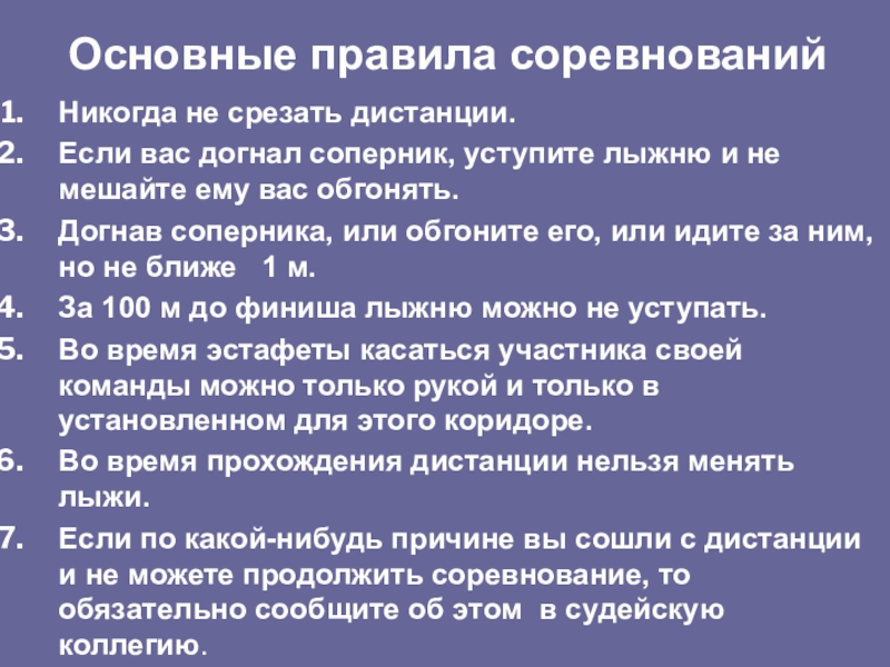 Никогда не срезать дистанции.Если вас догнал соперник, уступите лыжню и не мешайте ему вас обгонять.Догнав соперника, или