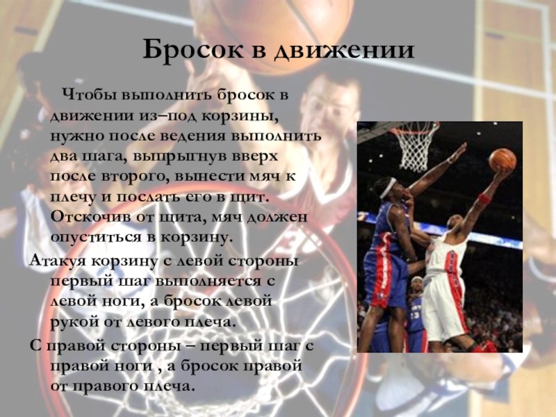из–под корзины, нужно после ведения выполнить два шага, выпрыгнув вверх после второго, вынести мяч к плечу и послать его в щит. Отскочив от щита, мяч должен опуститься в корзину.