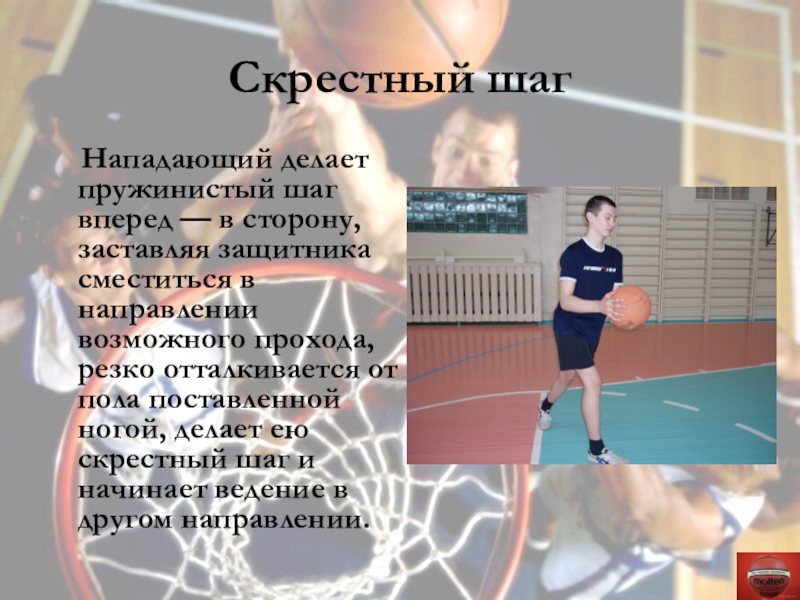в сторону, заставляя защитника сместиться в направлении возможного прохода, резко отталкивается от пола поставленной ногой, делает ею скрестный шаг и начинает ведение в другом направлении.