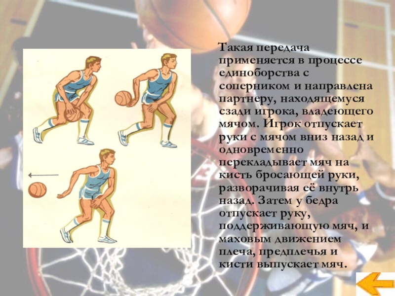 рукой снизу назад относится к передачам, выполняемым без центрального зрительного контроля. Такие передачи в процессе игры наиболее часто создают условия для выполнения броска мяча в корзину. Владение этими передачами в совершенстве намного увеличивает атакующий потенциал команды.