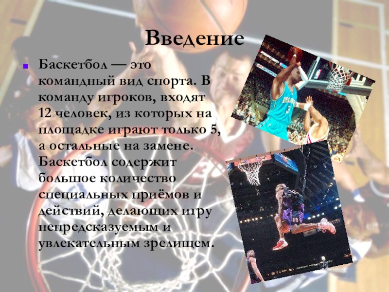 Баскетбол — это командный вид спорта. В команду игроков, входят 12