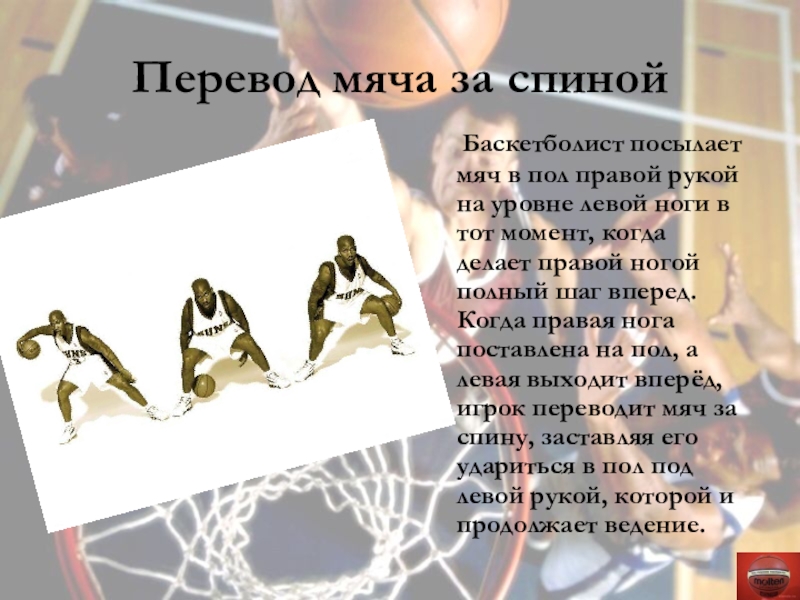 правой рукой на уровне левой ноги в тот момент, когда делает правой ногой полный шаг вперед. Когда правая нога поставлена на пол, а левая выходит вперёд, игрок переводит мяч за спину, заставляя его удариться в пол под левой рукой, которой и продолжает ведение.