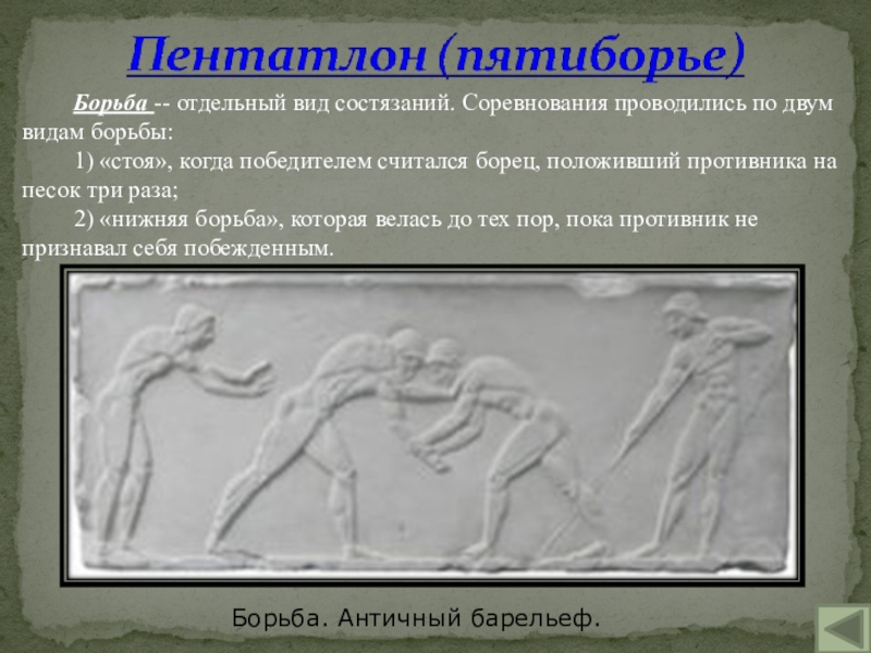 Метание копья – вид состязаний, навыки в котором были непосредственно связаны с жизнью людей, особенно воинов и охотников. Копье было деревянным, длиной в рост человека, заостренным спереди, на него надевали железный наконечник.