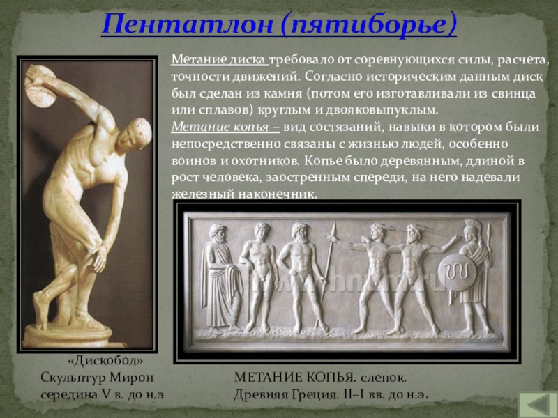 Метание диска требовало от соревнующихся силы, расчета, точности движений. Согласно историческим данным диск был сделан из камня (потом его изготавливали из свинца или сплавов) круглым и двояковыпуклым.
