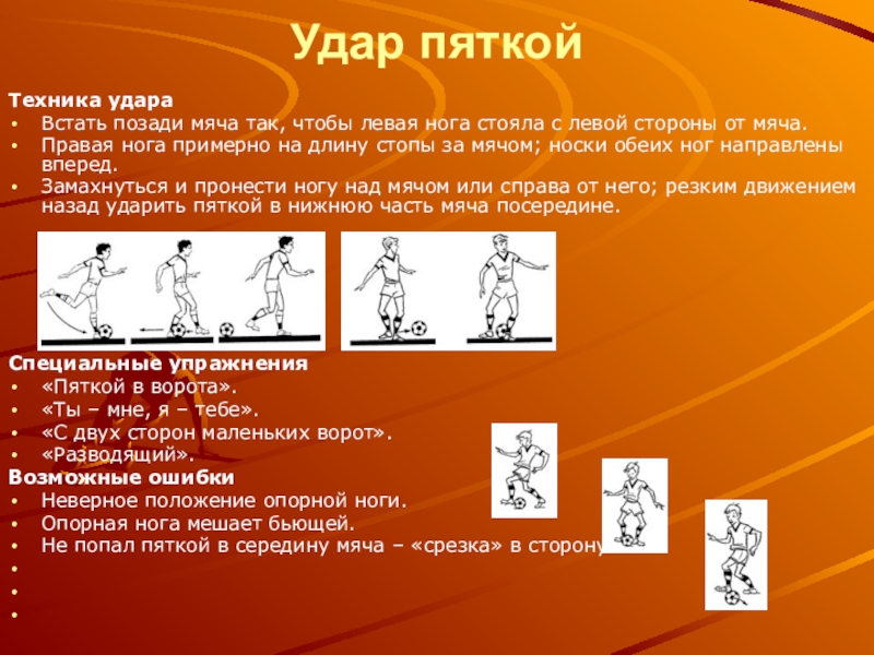 Замахнуться и пронести ногу над мячом или справа от него; резким движением назад ударить пяткой в нижнюю часть мяча посередине.