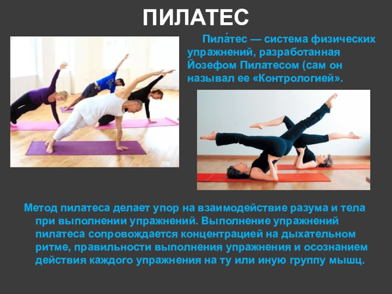 Метод пилатеса делает упор на взаимодействие разума и тела при выполнении упражнений. Выполнение упражнений пилатеса сопровождается концентрацией на дыхательном ритме, правильности выполнения упражнения и осознанием действия каждого упражнения на ту или иную группу мышц.