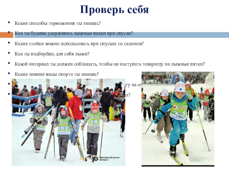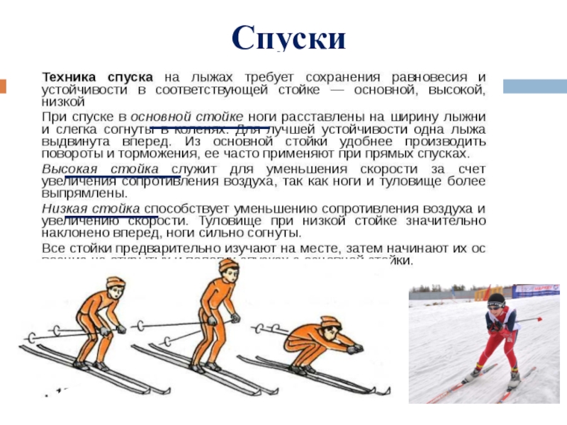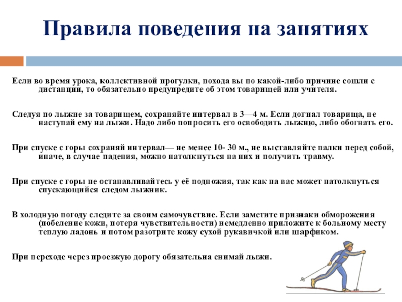 При спуске с горы сохраняй интервал— не менее 10- 30 м., не выставляйте палки перед собой, иначе, в случае падения, можно натолкнуться на них и получить травму.
