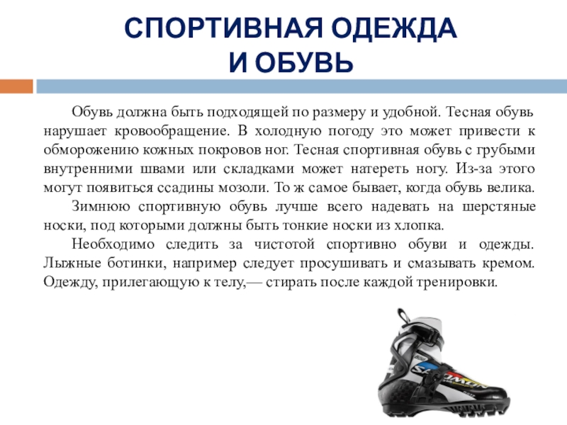 Необходимо следить за чистотой спортивно обуви и одежды. Лыжные ботинки, например следует просушивать и смазывать кремом. Одежду, прилегающую к телу,— стирать после каждой тренировки.