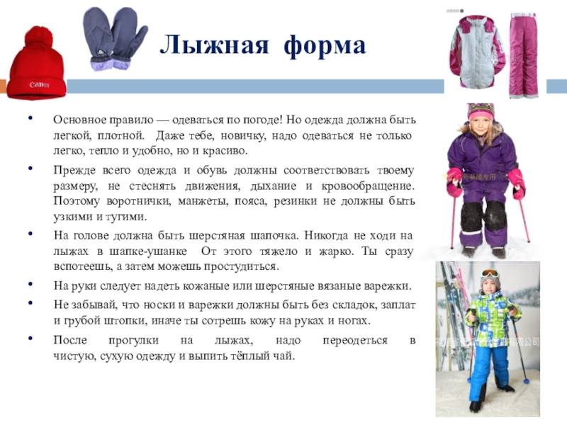 На голове должна быть шерстяная шапочка. Никогда не ходи на лыжах в шапке-ушанке От этого тяжело и жарко. Ты сразу вспотеешь, а затем можешь простудиться.